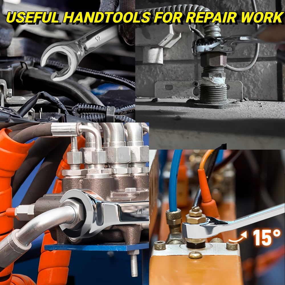 Includes 12 total wrenches: Metric (6x8 to 19x21mm) and SAE (1/4x5/16" to 3/4x7/8"), laser-etched on both sides for fast identification. - 【Flare Nut Jaws for Tight Grip】