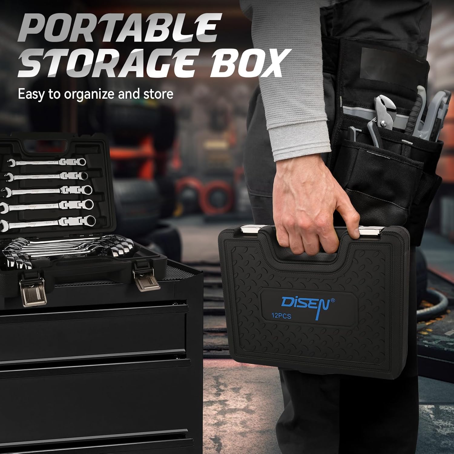 DISEN 13-Piece Flex Head Ratcheting Wrench Set SAE | Double Jointed, Long Open & Box End Wrenches 1/4''–3/4'' | 72-Tooth CR-V Steel with Storage Case