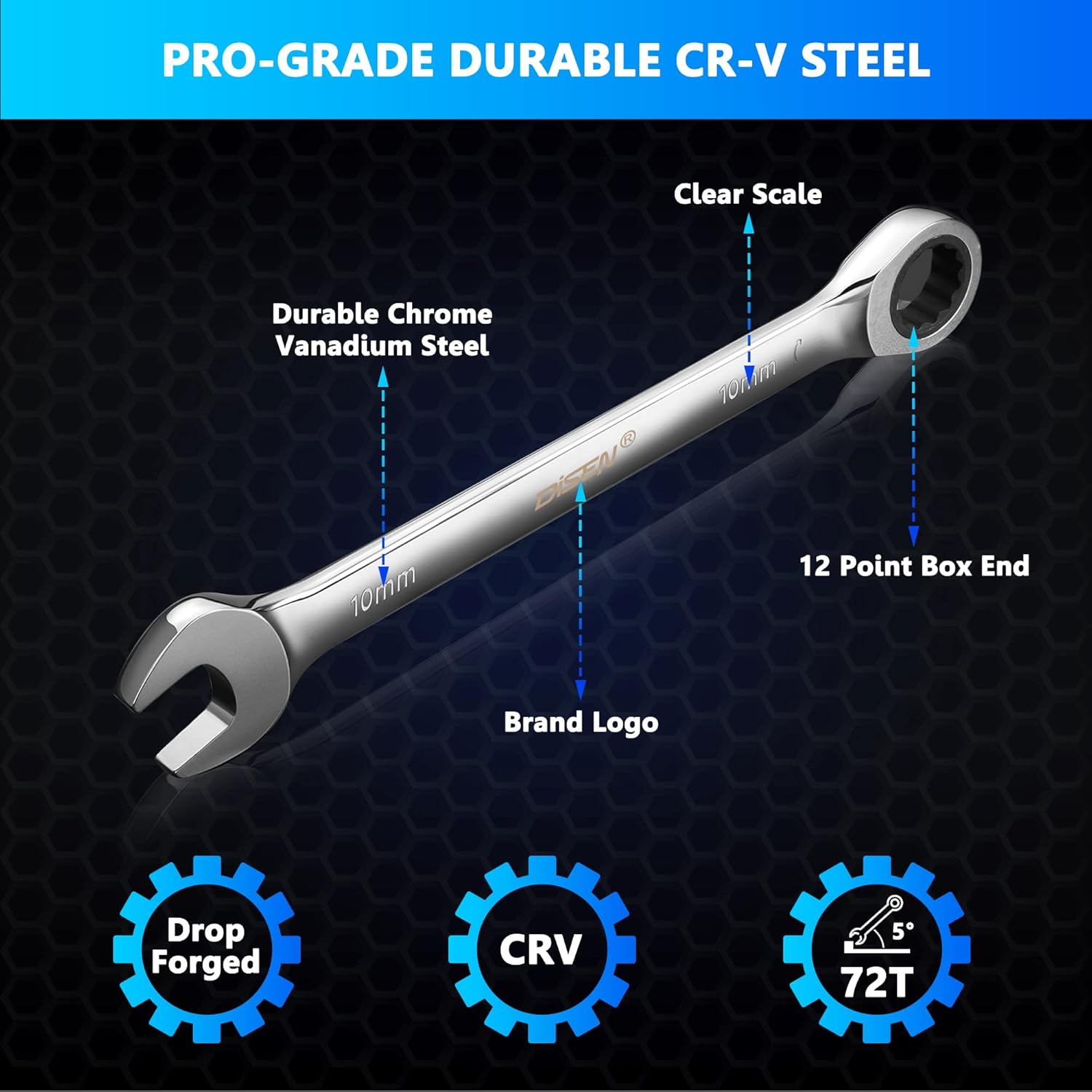 Take on any repair with confidence using the DISEN 22-Piece Ratcheting Wrench Set. Covering both SAE and Metric sizes, each wrench features a 12-point box end and a 72-tooth ratcheting mechanism for smooth operation even in tight spots.