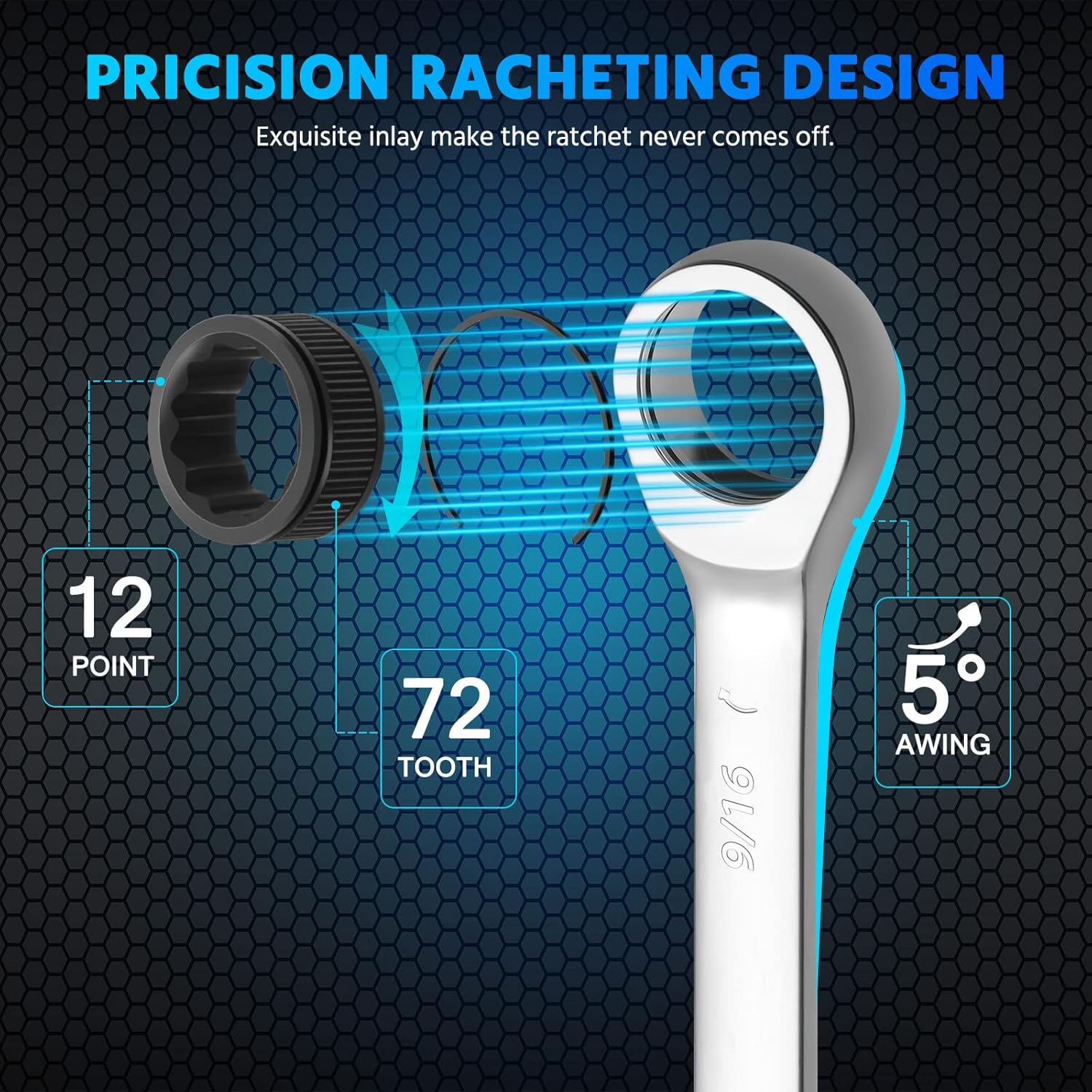 Includes 22 total sizes: Metric (6–18mm) and SAE (1/4"–3/4"), clearly etched for fast size recognition and convenient use. - 【12-Point Box End + 72-Tooth Ratchet】
