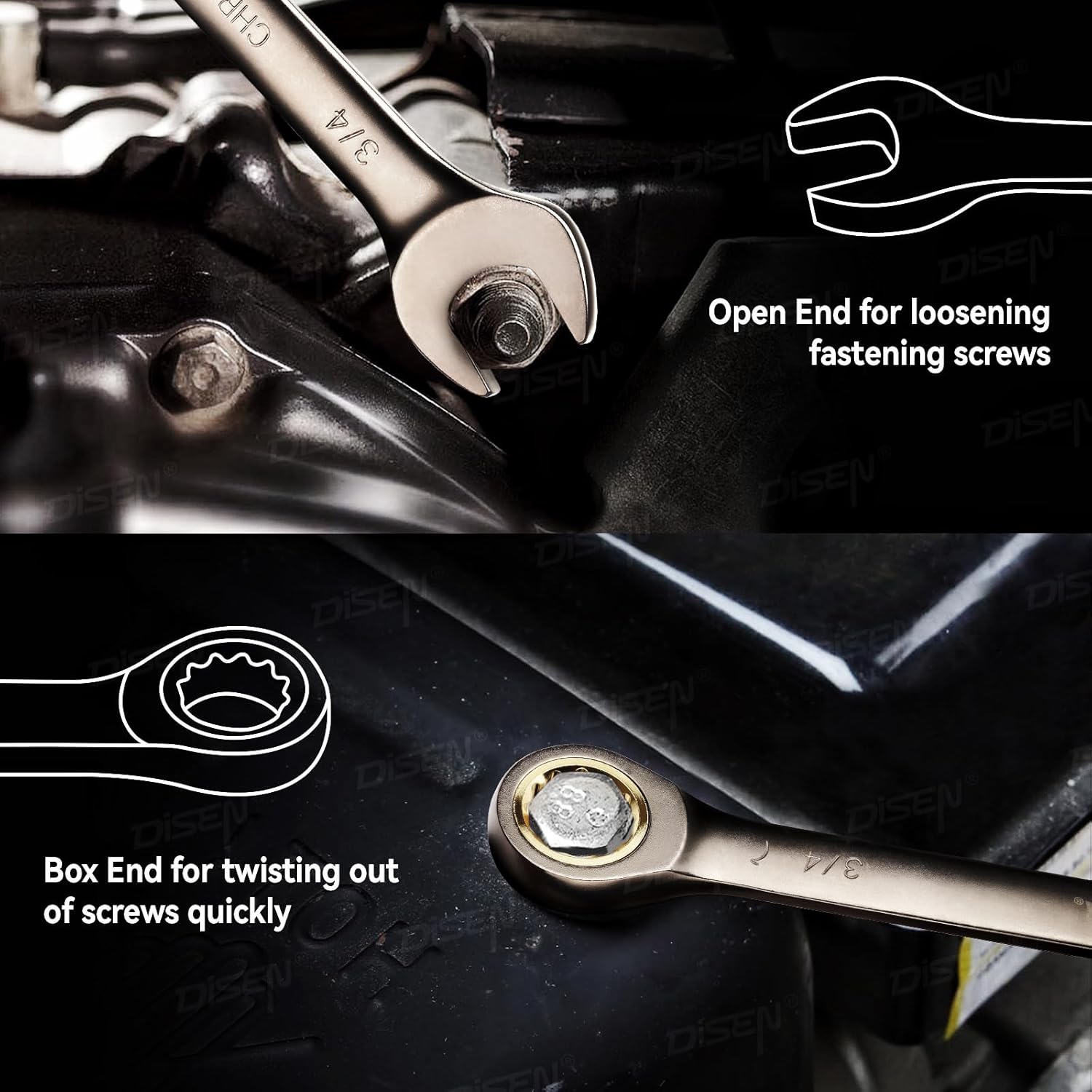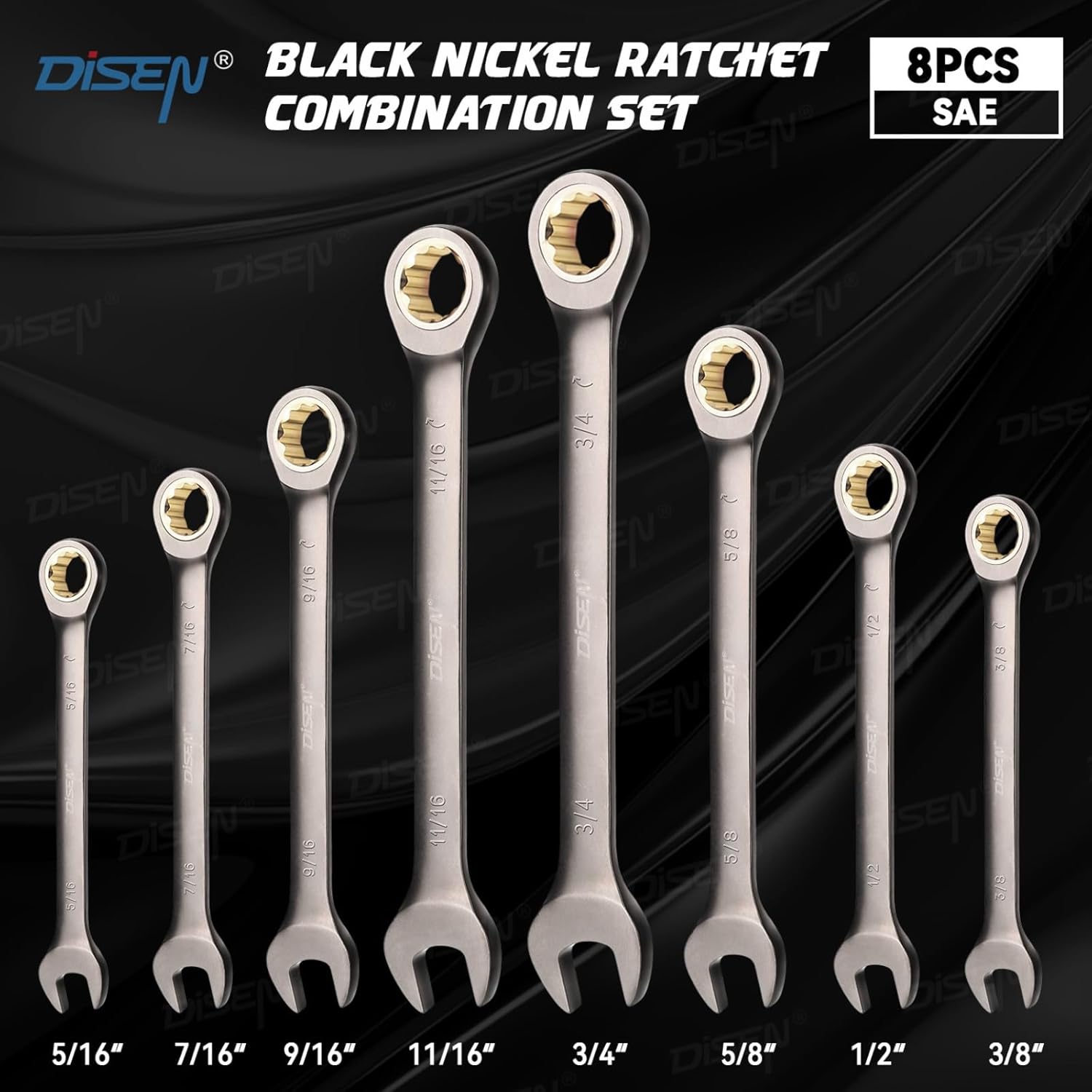Crafted for professionals and DIYers alike, the DISEN 8PCS SAE Ratcheting Wrench Set delivers performance, durability, and style. Built from high-strength CR-V steel and coated with a sleek black nickel finish, these wrenches combine toughness with corrosion resistance.
