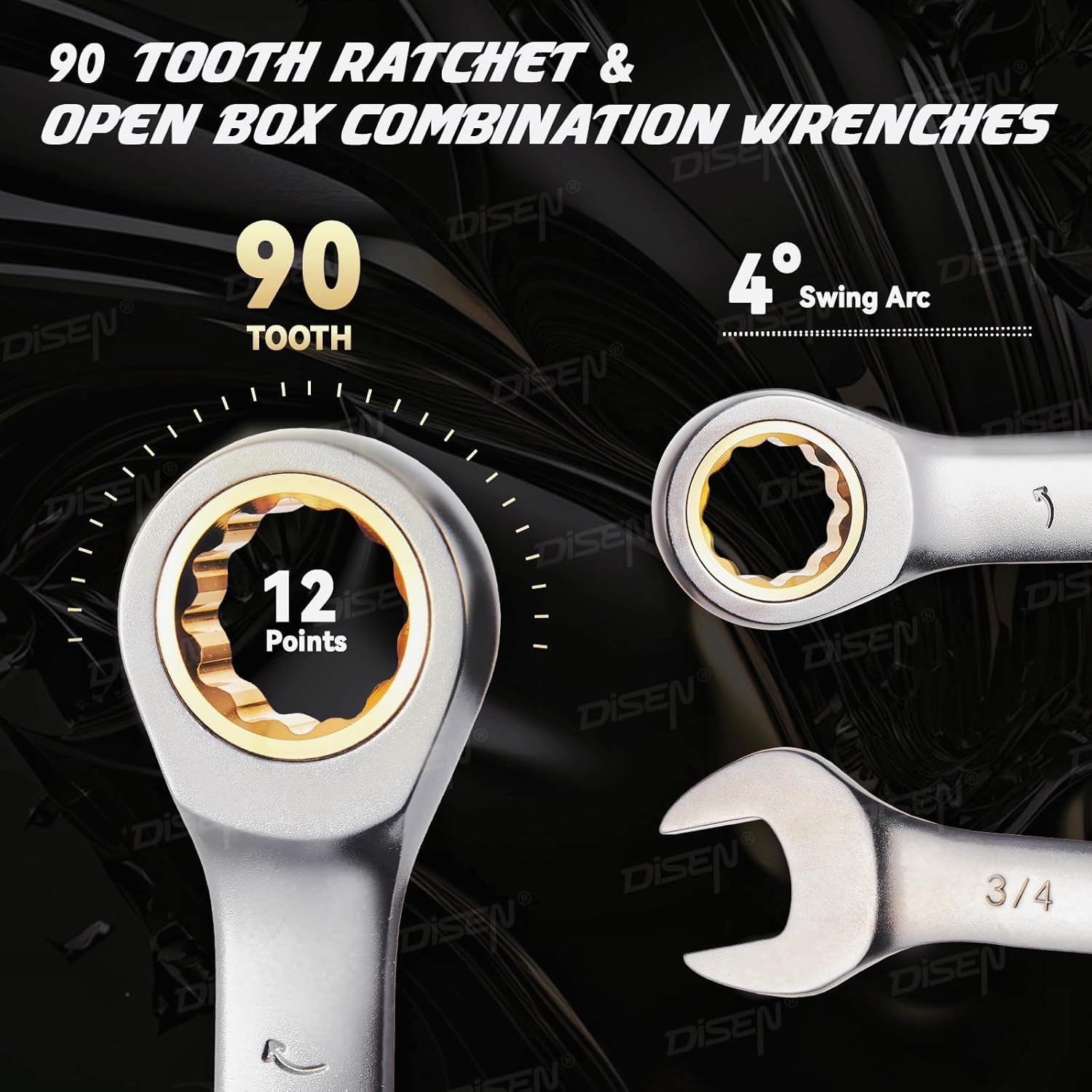 DISEN 8PCS SAE Ratcheting Wrench Set – 90-Tooth, CR-V Steel, Black Nickel Finish, Open & Box End with Organizer